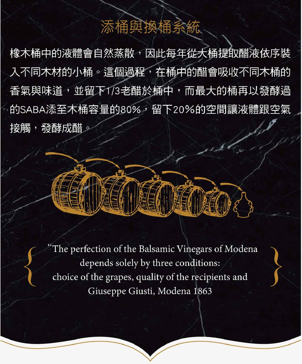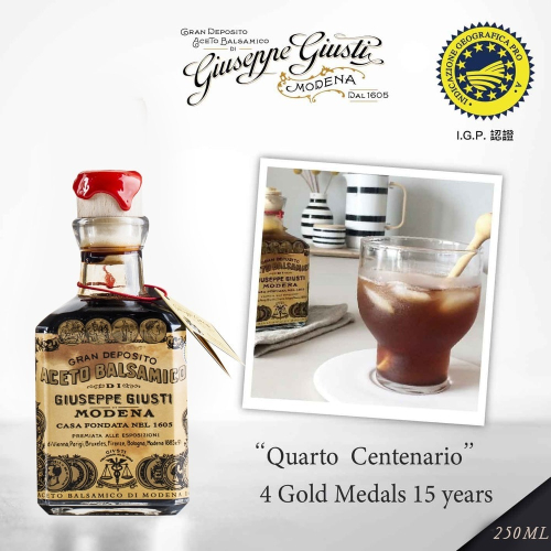 Giusti - 4 Gold Medals 15 years 為紀念朱斯蒂家族400週年而誕生的巴沙米克醋,非常濃稠的質地與深沈的香氣,特徵是濃郁成熟的水果香氣,因為陳年時間長及木桶的特性,帶出焦糖、煙燻、烘培咖啡和木質的香氣。