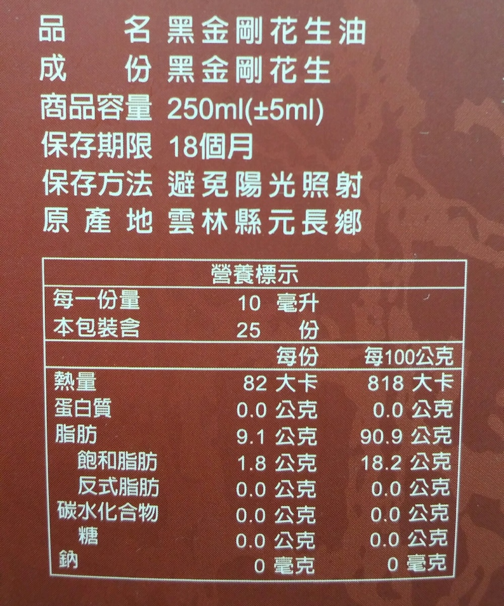 商品:黑金剛花生油250±5ml/瓶,共2瓶,附提袋