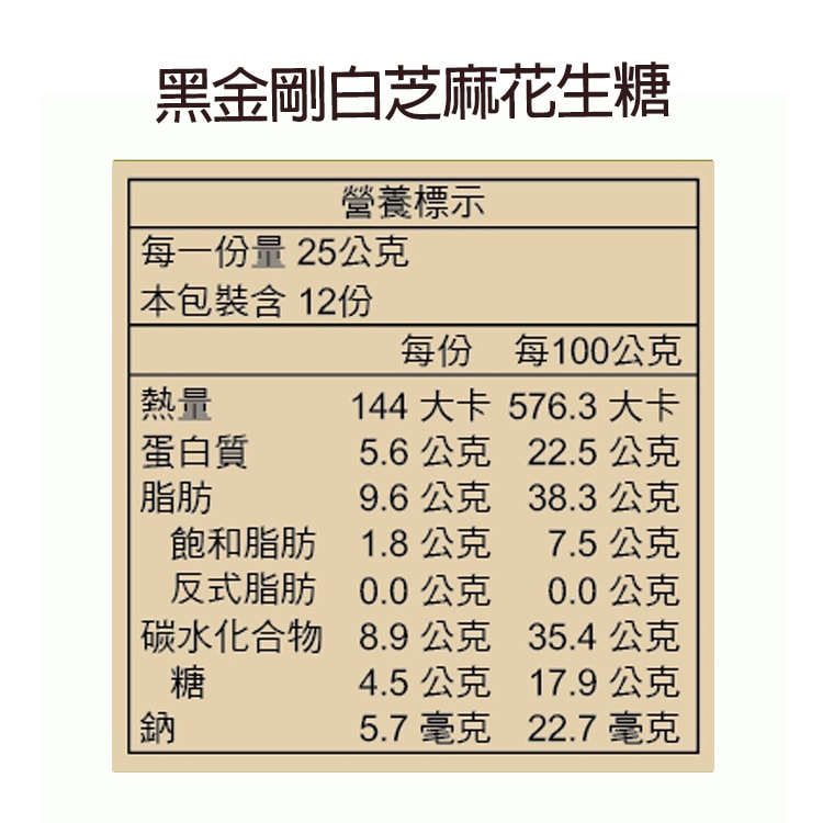 成份:黑金剛原味花生糖-黑金剛花生、麥芽糖、蔗糖/黑金剛白芝麻花生糖-黑金剛花生、白芝麻、麥芽糖、蔗糖