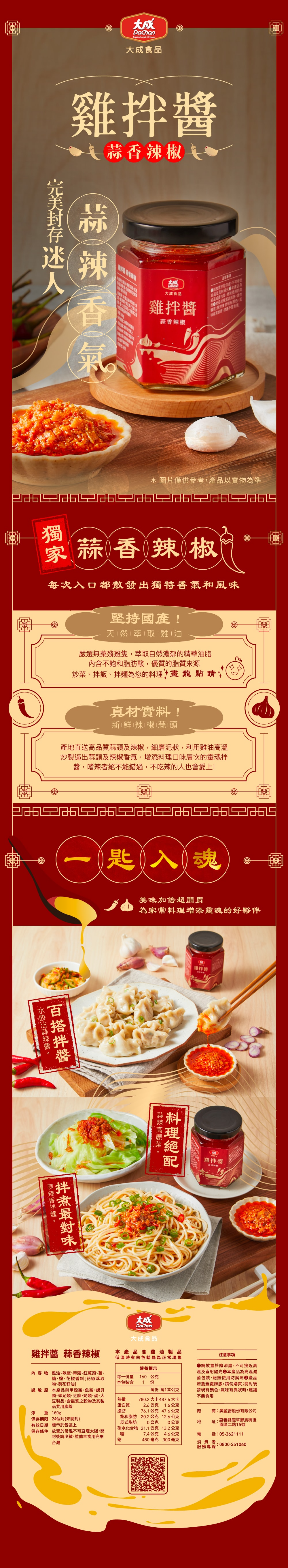 商品名稱:【大成食品】雞拌醬-蒜香辣椒160gx5入組