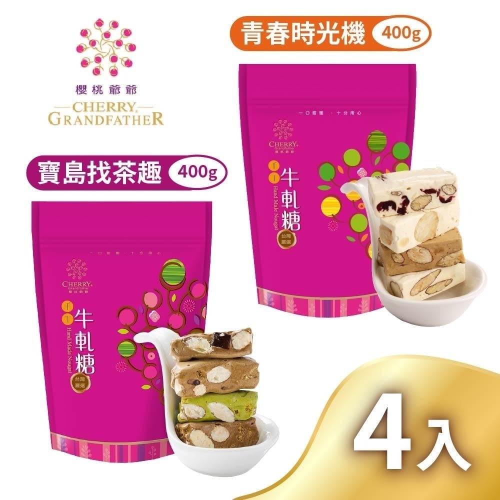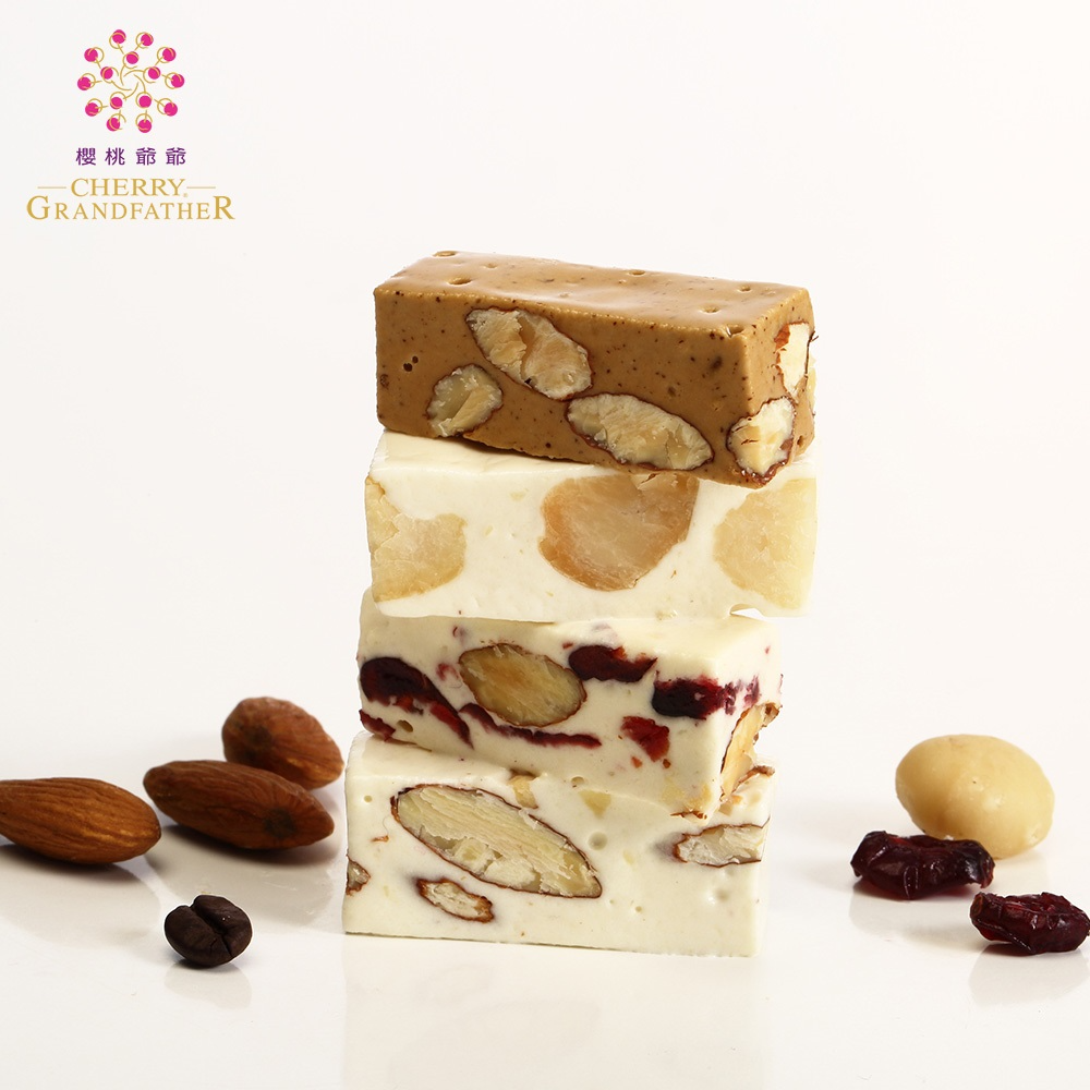 青春時光機牛軋糖:麥芽糖、精選加州杏仁、澳洲火山豆、加州蔓越莓(蔓越莓、糖、葵花油)、紐西蘭高級奶粉、砂糖、進口奶油、乳糖、海藻糖、蛋白、巴西碳燒咖、麥芽糊精(糊精、麥芽糖、葡萄糖)、海鹽