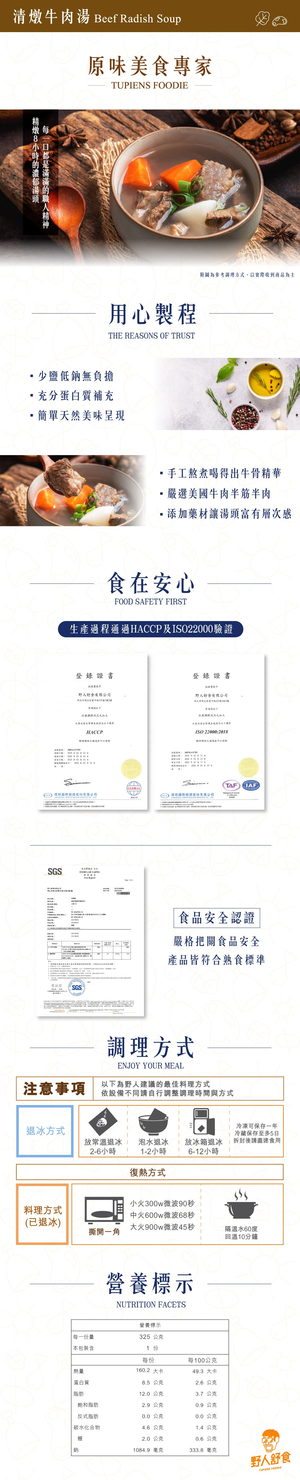 1.商品品名: 【野人舒食】主廚手作湯品 - 清燉牛肉湯 325g 個人包 (個人獨享包) 10包