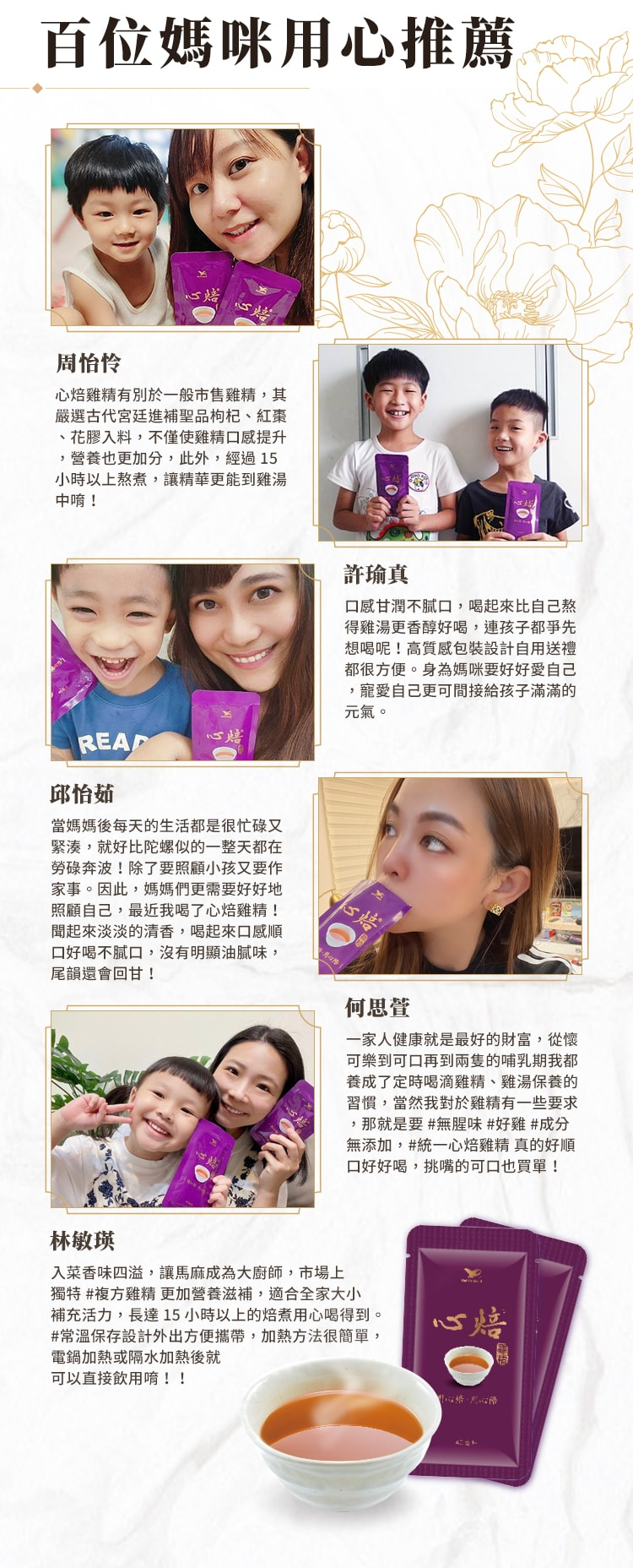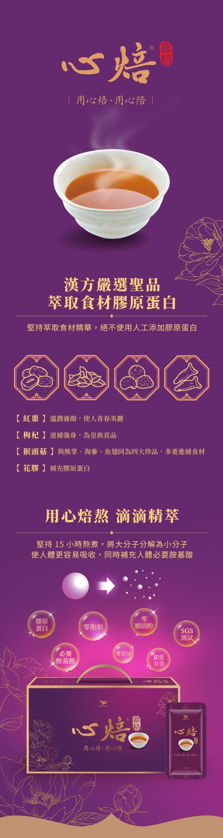 *本產品所添加土雞、鮑魚、薑、枸杞、猴頭菇、紅棗、花膠等食材,經長時間熬煮後去除。