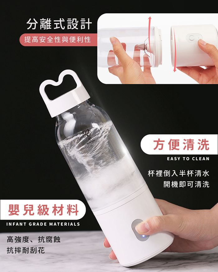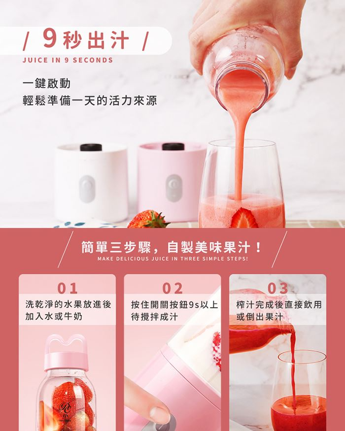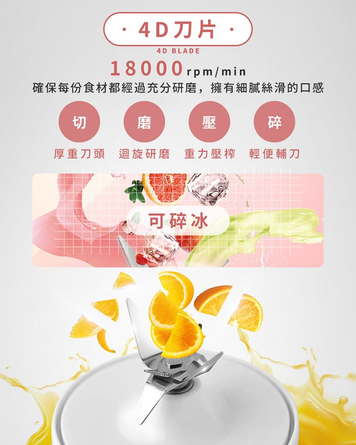 M型設計,方便攜帶 一鍵啟動,9秒出汁 倒入清水,快速清洗 4D刀片,切磨壓碎都可
