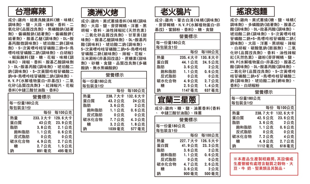過敏原:如上圖所示;本產品生產製程廠房,其設備或生產管線有處理含麩質之穀物、甲殼類、大豆、牛奶、堅果類、芝麻及其製品