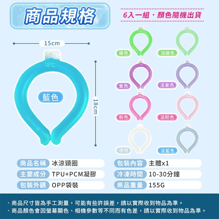 【商品名稱】 冰涼頸圈6入組(隨機色出貨)