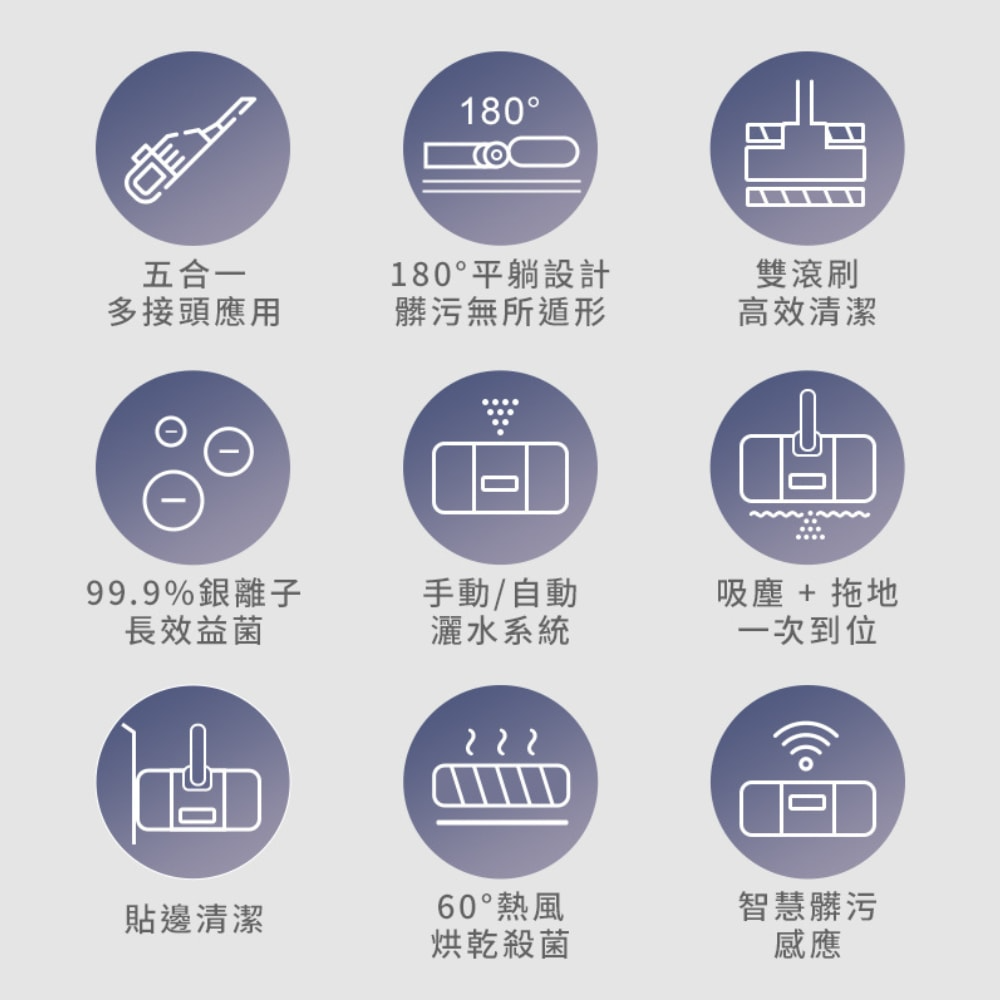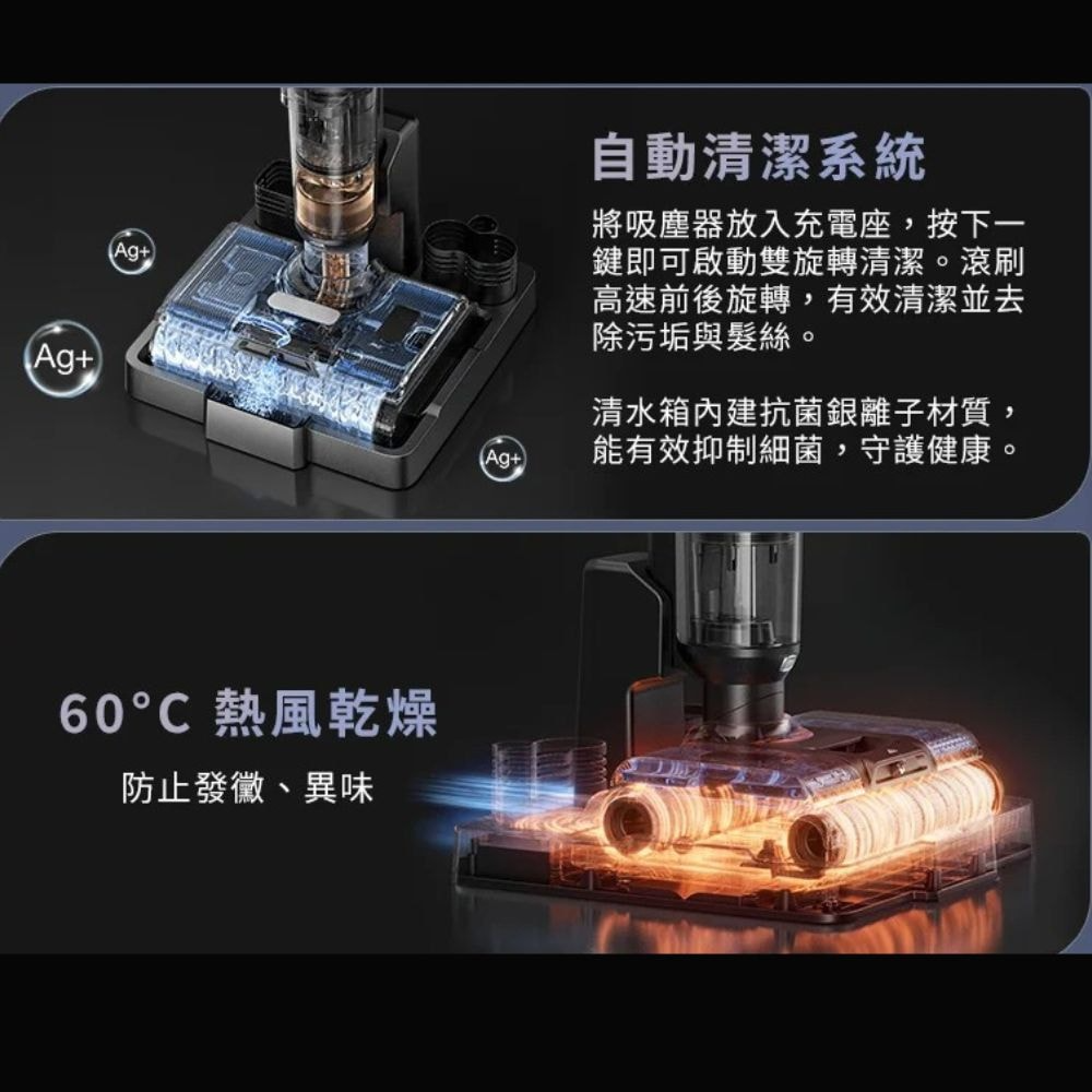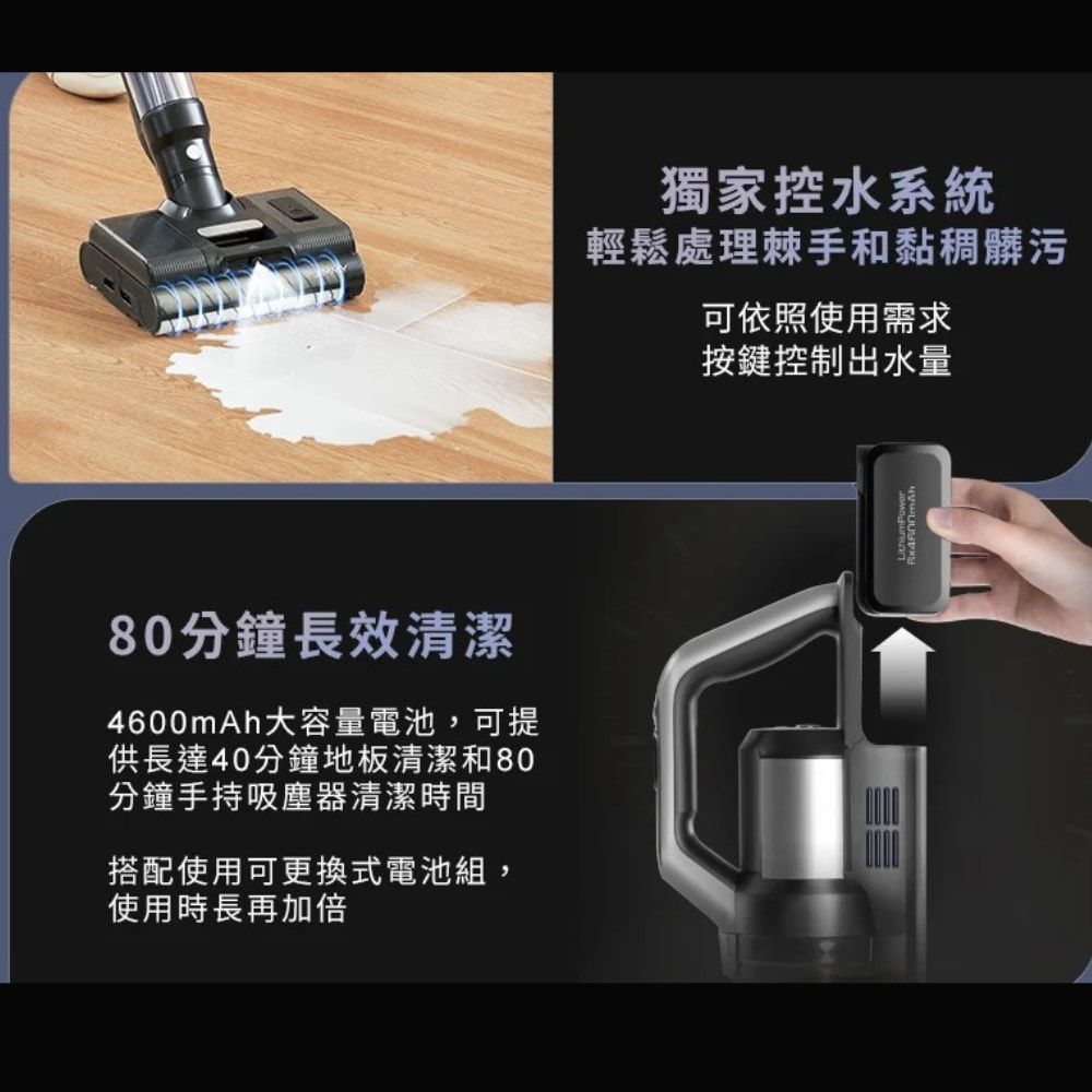 功能:吸塵+清洗,可拆卸手持式LED螢幕,灰塵感應器,5種語言,自清潔,60°熱風乾燥,自動+手動噴水
