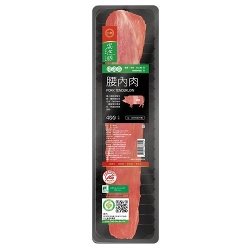 取豬腰內肉修除脂肪、淋巴結及筋膜,每盒1條、400公克封盒包裝;