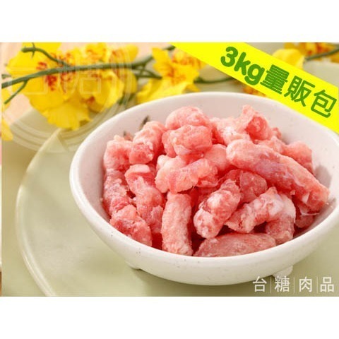 精選修除筋膜、淋巴及軟骨的豬前後腿部位肉絞製而成,顆粒口徑約1公分,脂肪含量約15%,每包3公斤封袋包裝;