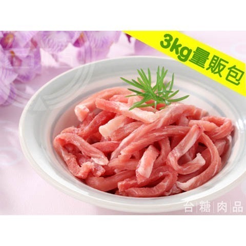 以健康新鮮的豬前腿肉,去皮、修整切製而成,脂肪含量少,切製寬約0.4公分肉絲條狀,每包3公斤封袋包裝;