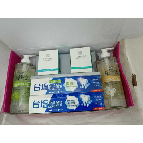 ■內容物:植淨感-健髮強韌洗髮精500ml+植淨感-淨嫩柔膚沐浴露500ml+蓓舒美海鹽淨膚皂100g+蓓舒美海藻潤澤皂100g+台塩塩淨固齒牙膏150g+台塩塩淨晶亮牙膏150g