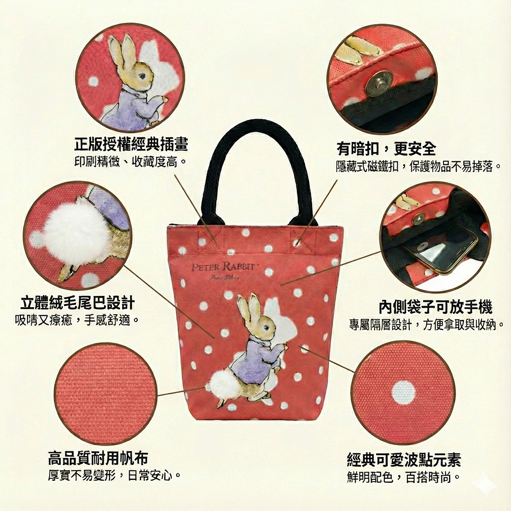 經典比得兔插畫、立體兔尾巴、耐用帆布材質,外型甜美、用途百搭。
