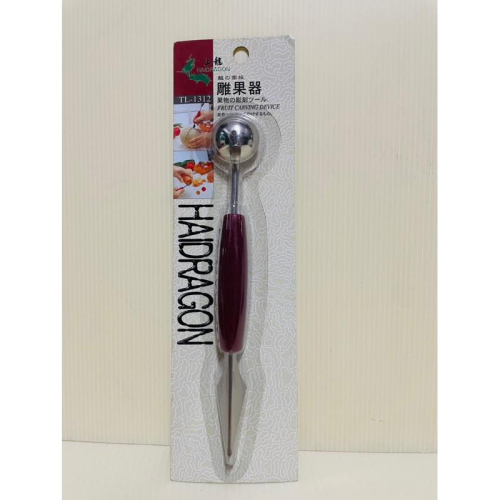 上龍不銹鋼雕果器 一入 產地中國.台灣監製 材質-手柄(塑膠)/金屬(不銹鋼) 【特性】 錐形鋸齒設計,雕出特殊造型。 圓形挖孔設計,可挖出圓球造型。 1支兩用方便俐落。 【使用及保存方法】 勿置於高溫火源處,避免手柄融化變形。 尖角及挖球處請確實洗淨再使用。 【注意事項】 錐角尖利,請置於兒童不易取得處。