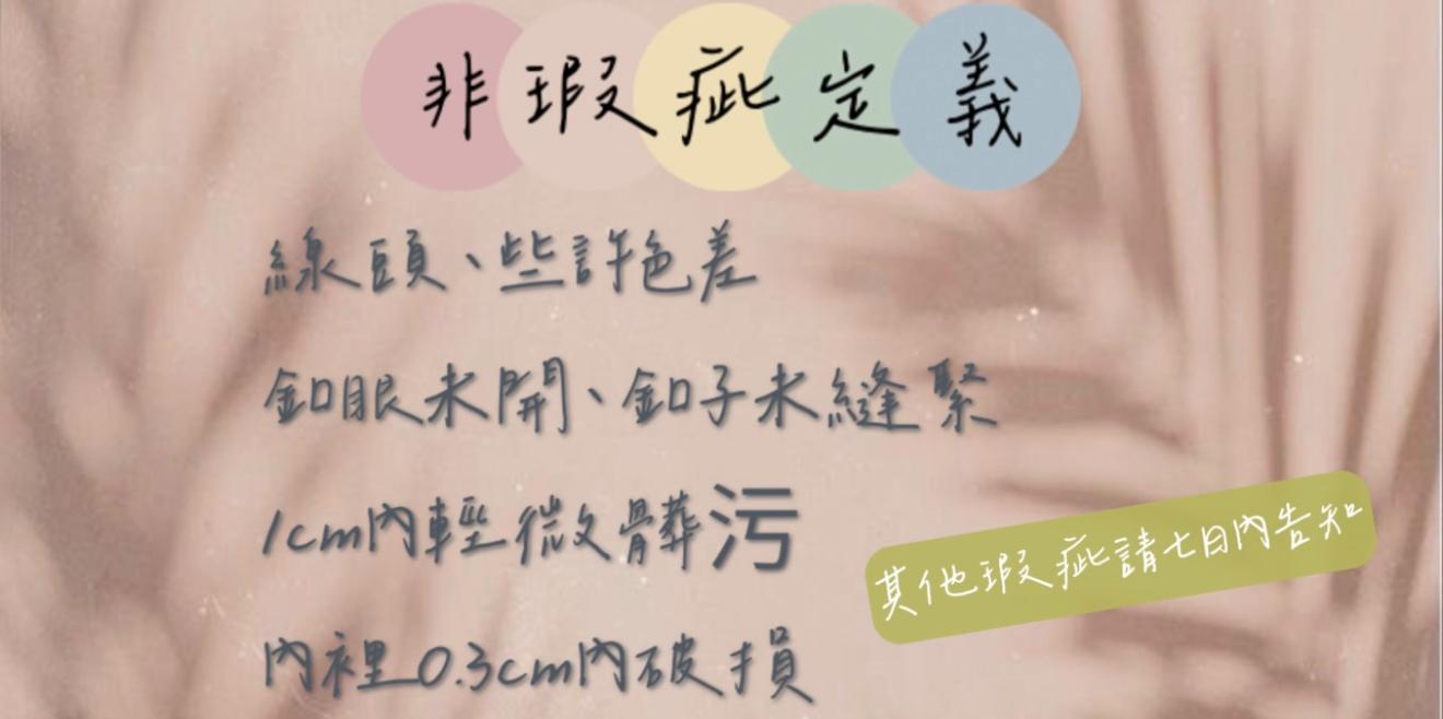 <p class="p1" style="margin-bottom:0px&#59;font-size:21px&#59;line-height:normal&#59;color:rgb(0,0,0)&#59;"><span class="s1" style="font-family:UICTFontTextStyleBody&#59;">☘︎</span><span style="font-family:UICTFontTextStyleBody&#59;"> 瑕疵問題請於收貨起算2日內拍照反應,上列定義不接受退換貨!</span></p><p class="p1" style="margin-bottom:0px&#59;font-size:21px&#59;line-height:normal&#59;color:rgb(0,0,0)&#59;"><span style="font-family:UICTFontTextStyleBody&#59;">遇非瑕疵定義之其他情況可接受更換同款同色,如要更換顏色尺寸視同換貨處理買家需自付來回運費。</span></p>