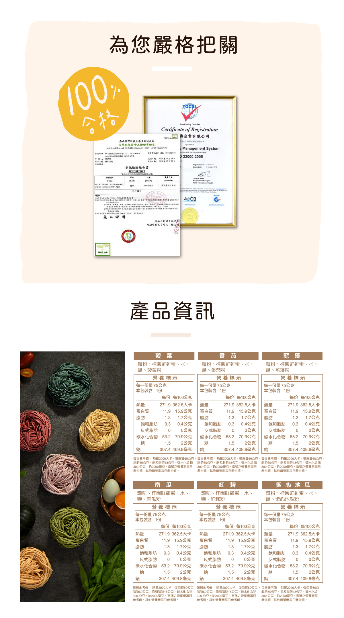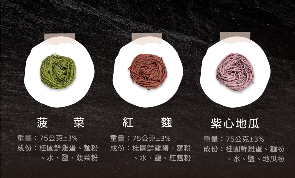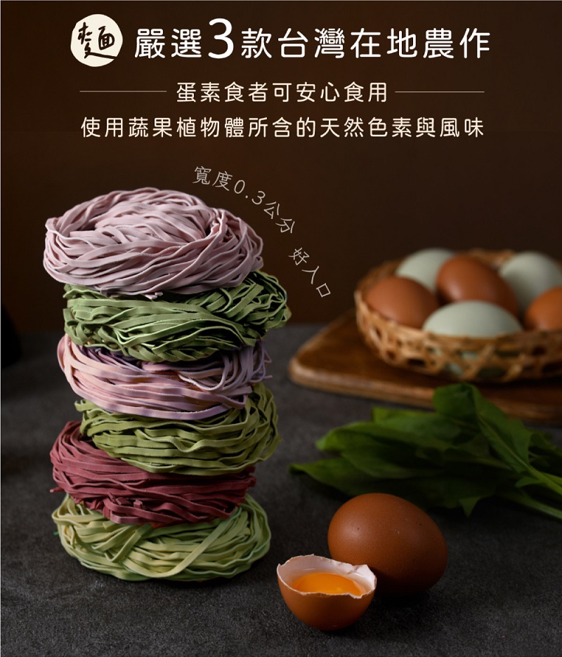 麵條3款風味:菠菜、紅麴、紫心地瓜。(蛋素可食)