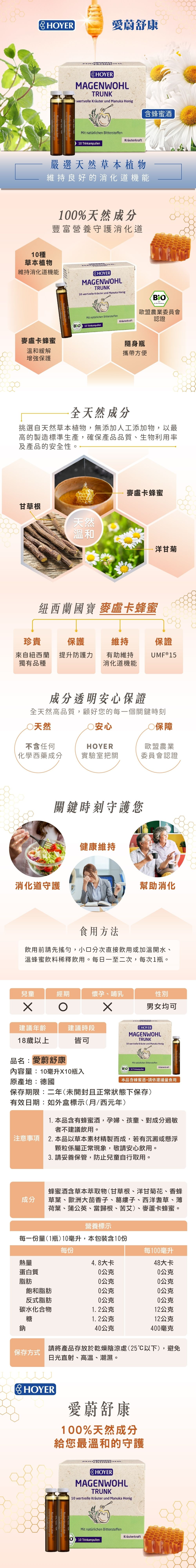 • 運用麥蘆卡蜂蜜及多種草本植物製成飲品,可促進食慾、幫助消化,維持良好的消化道機能。
