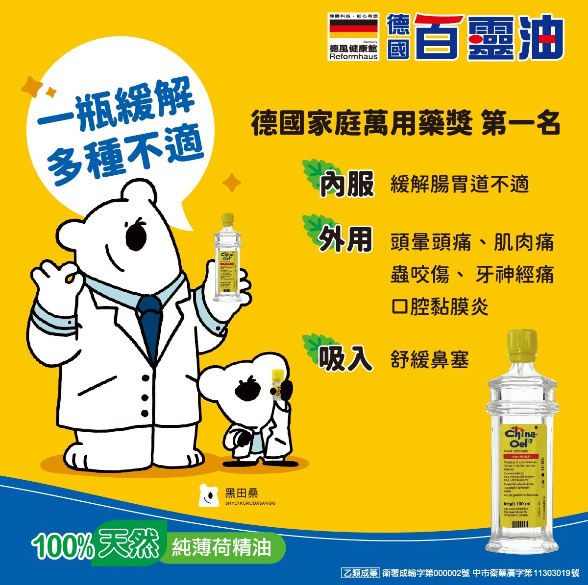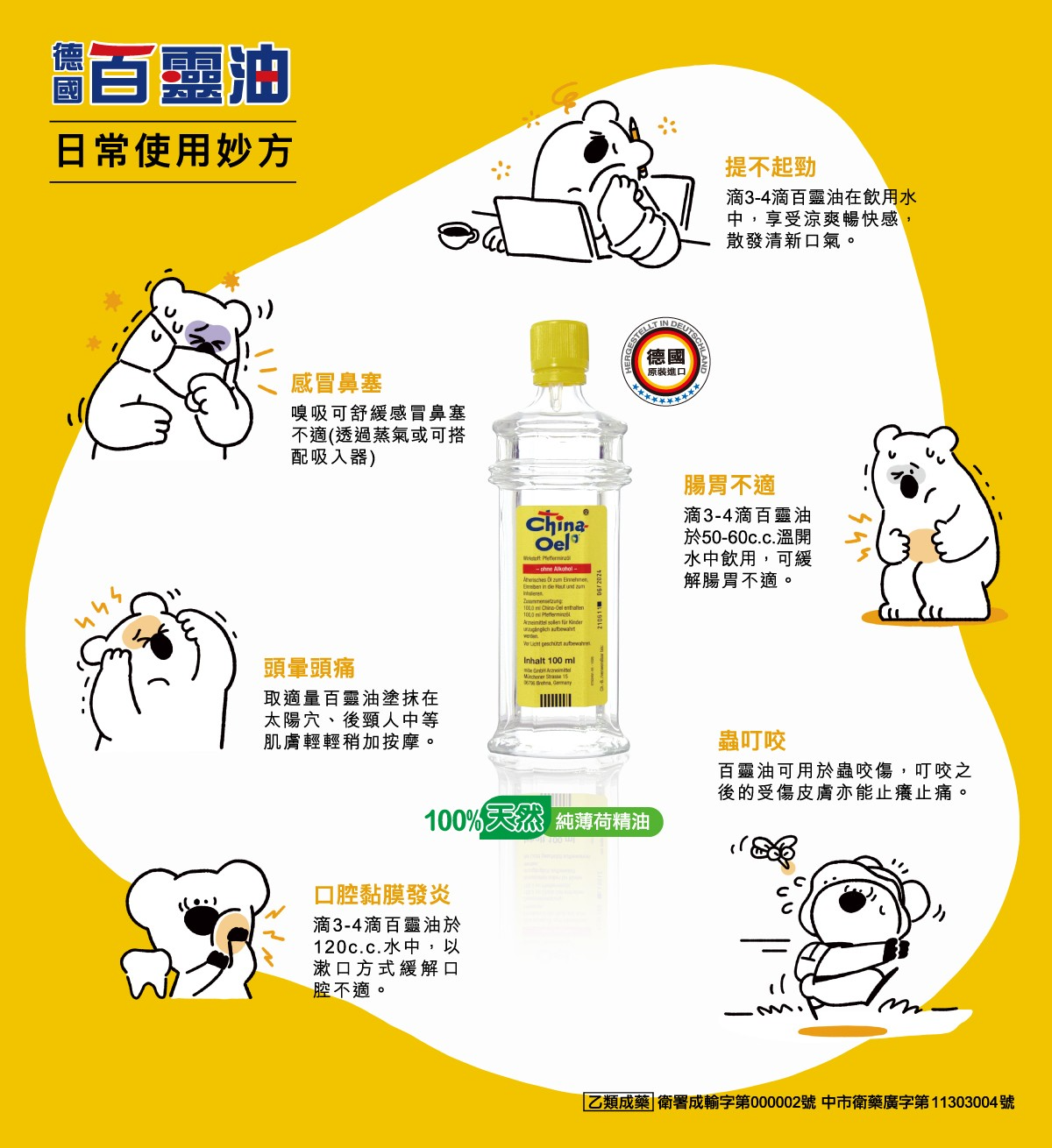 ◆德國進口,為了紀念胡椒薄荷的原產地為中國,因此在瓶身上印上「中油中」並取名為China oel (中國油),並非中國所製造的產品