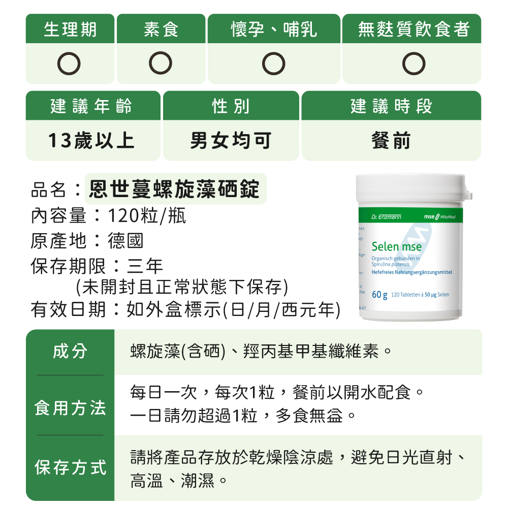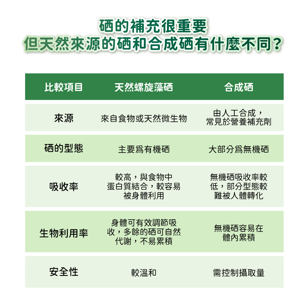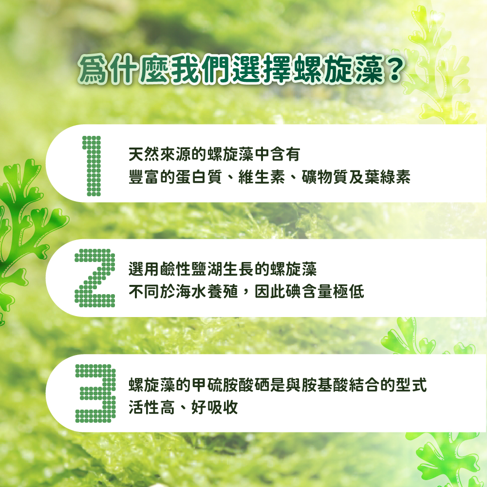 • 恩世蔓螺旋藻硒錠–甲硫胺酸硒型式,大幅增加吸收率