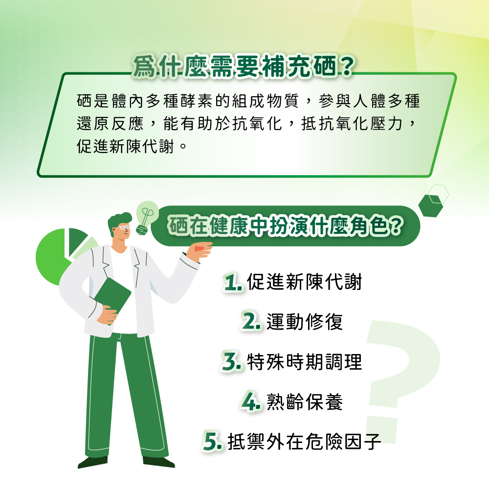 • 硒是200多種酶的組成物質,參與體內各式代謝作用,幫助調節生理機能,增強體力。