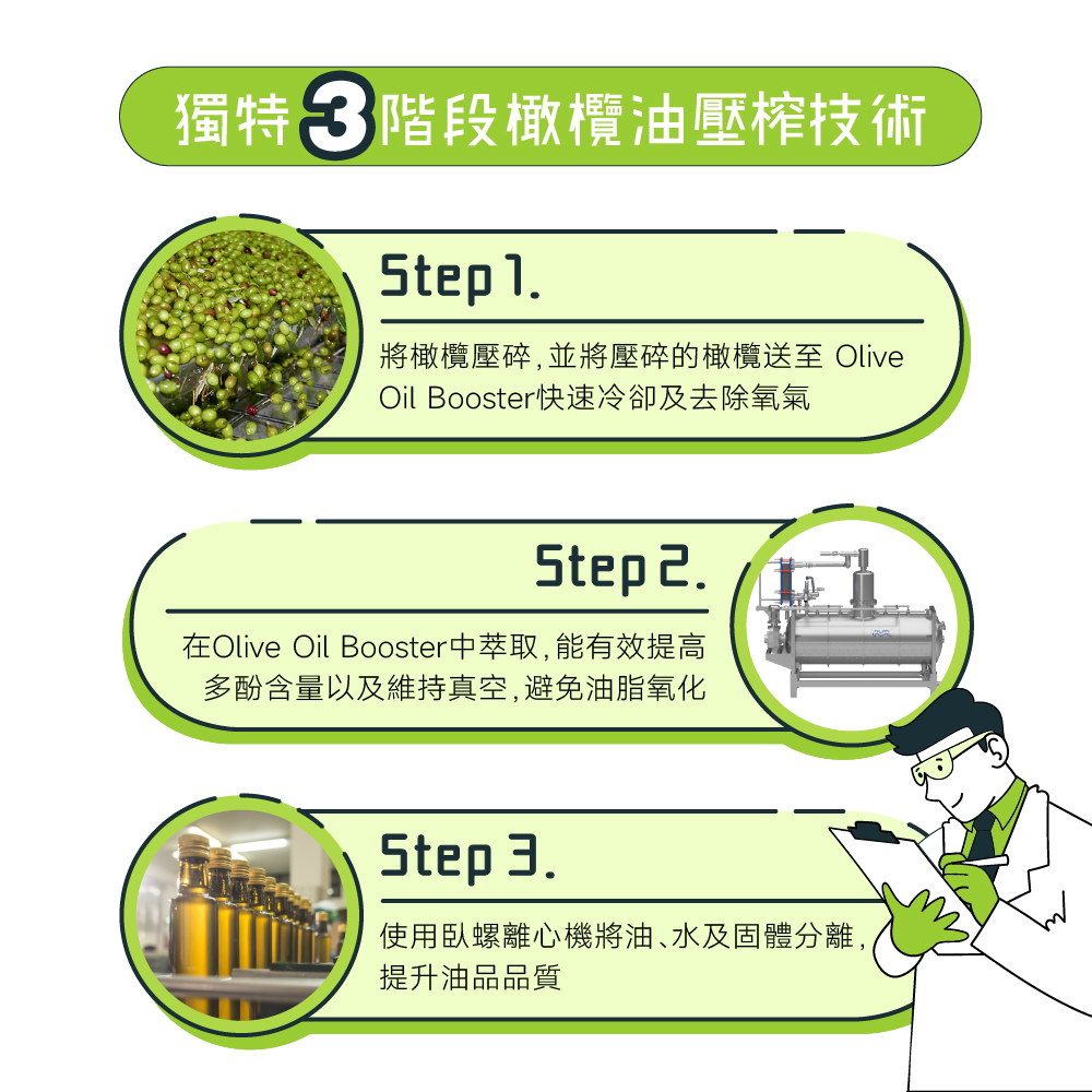• 來自Minisci集團的農場,將採下來的新鮮橄欖直接低溫壓榨出第一道的初榨橄欖油,並於12小時內裝瓶完成