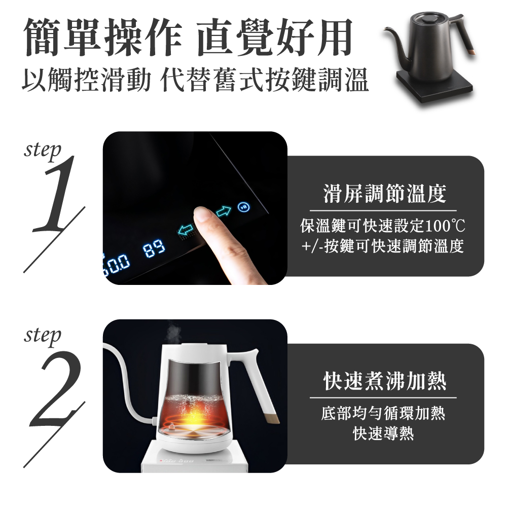 溫度控制範圍廣泛,從40°C到100°C,600ml的水只需約3分鐘即可加熱至90°C,