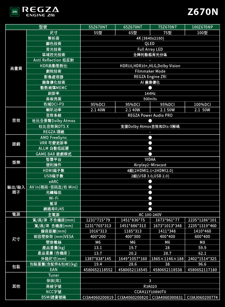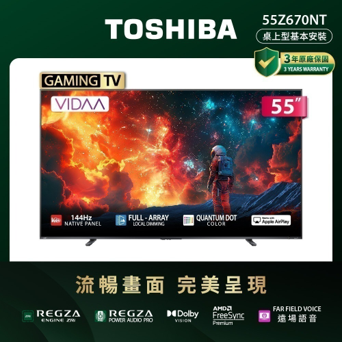 TOSHIBA 東芝 REGZA 55型 4K QLED 144Hz Full Array LED AirPlay2 智慧顯示器 55Z670NT(含基本安裝)