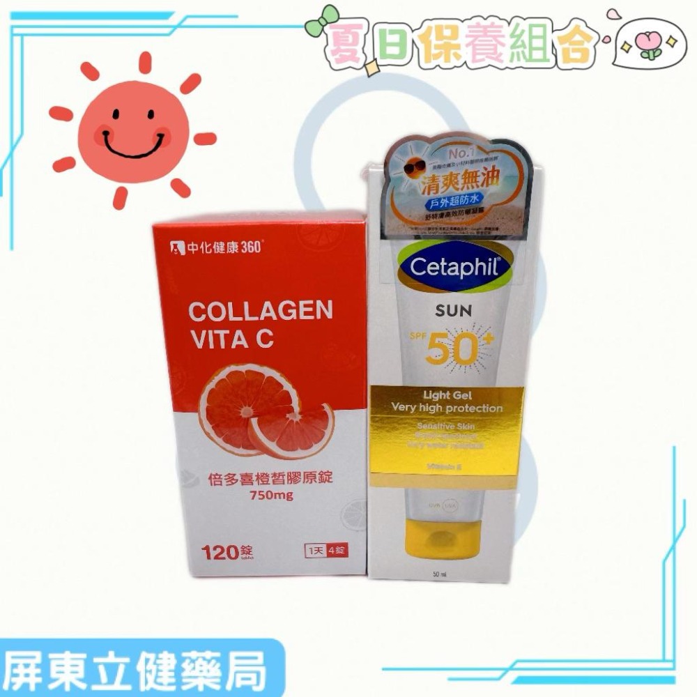 ☀️炎炎夏日到啦☀️ 接下來到了暑假假期,不少人都有安排出遊的規劃,像是到海邊或者出國走走,是不是很怕肌膚會曬傷呢😩😩 帶上一組夏日保養組合,ㄧ邊保護皮膚,ㄧ邊保養自己☀️☀️ ☀️舒特膚 高效防曬凝露 SPF50☀️ ⛱️ 清爽無油 戶外超防水:有效預防曬傷、曬老、曬黑 ⛱️適用於一般及敏弱油性膚質 ⛱️臉部及身體高效防曬 ⛱️針對紫外線高曝曬或光敏感肌膚,可提供高效防曬 ⛱️低敏配方,不易致粉刺、清爽不黏膩、好吸收 ⛱️不添加香精及Paraben類防腐劑、防水性極佳 ☀️中化健康360 倍多喜橙皙膠原口含錠☀️ ⛱️ 肌膚防曬+亮白+提升保濕度 ⛱️肌膚彈性+提升光澤+抗氧化 ⛱️產品含維他命C能促進膠原蛋白的形成, 助於撫平細紋 《藥商資訊》 ◢ 藥商許可執照所載藥商名稱:立健藥局 ◢ 藥商地址:屏東市勝利里廣東路962號 ◢ 諮詢電話:08-7328039 ◢ 藥商許可執照字號:屏縣藥局字第5943012892號 ◢ 食品業者登錄字號:T-200007314-00000-3