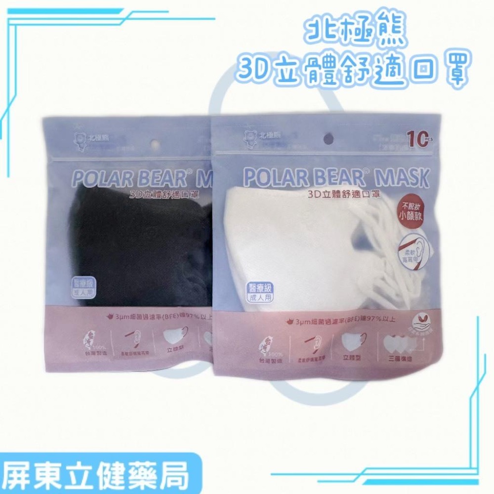 (屏東立健藥局)北極熊醫用口罩(未滅菌) 3D立體舒適 不脫妝小顏款 黑/白 10入/包