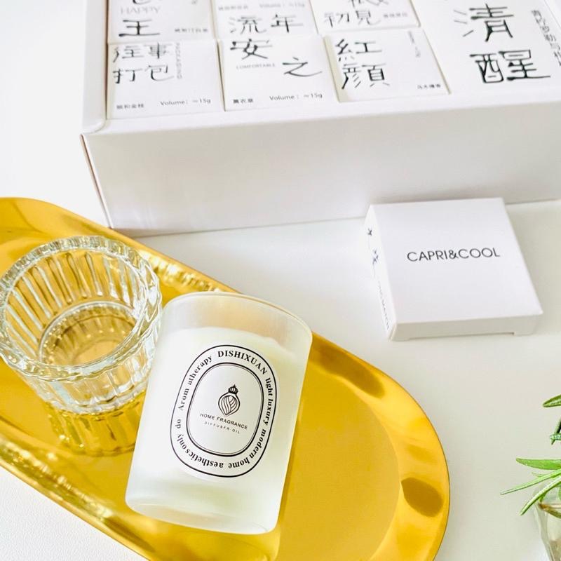 紙盒上優雅詞句,空氣間飄著迷人的蠟燭香氣, 清新甜蜜帶著芬芳。