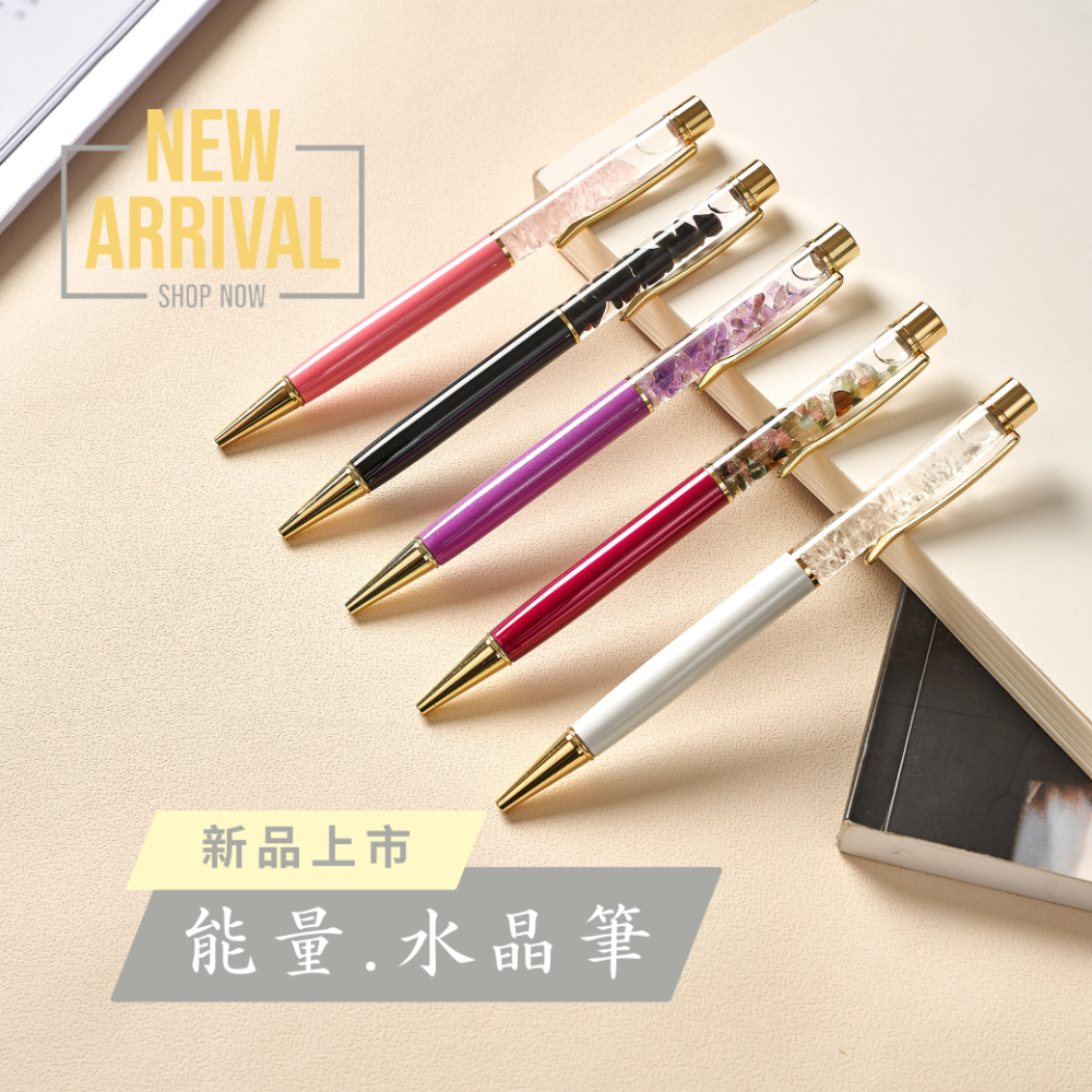 能量水晶筆,天然水晶閃耀流動,書寫間展現獨特魅力!標準筆芯,書寫順暢,替換方便。單支送羊毛氈筆套,買五支,加贈限量卷軸筆袋!✨