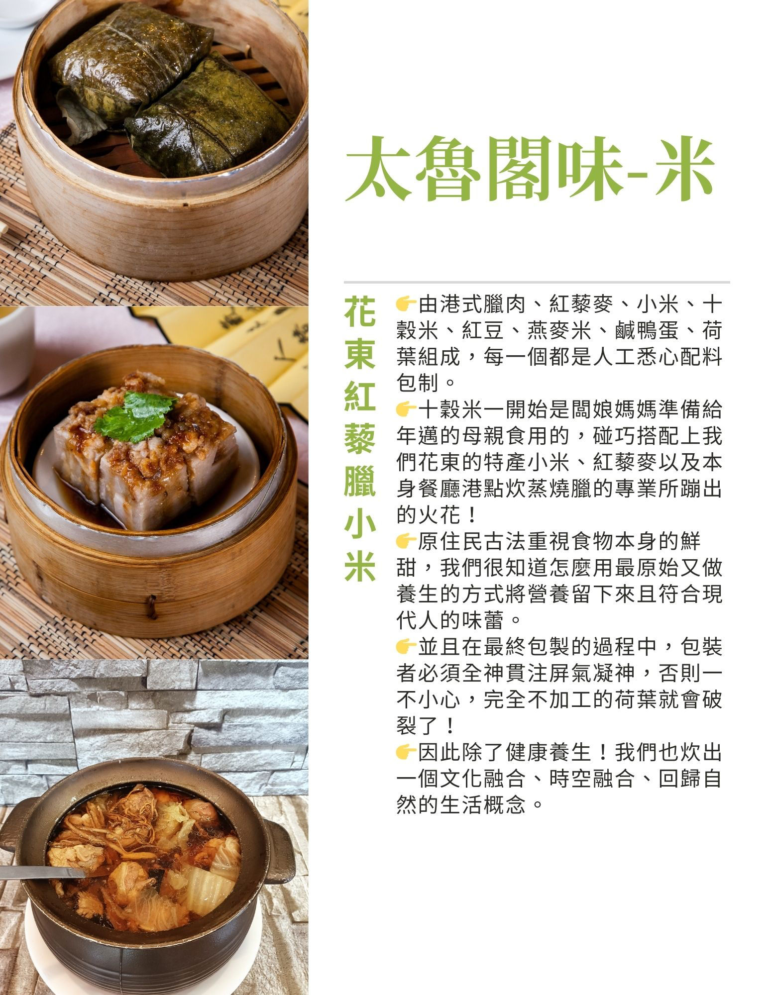 👉十穀米一開始是闆娘媽媽準備給年邁的母親食用的,碰巧搭配上我們花東的特產小米、紅藜麥以及本身餐廳港點炊蒸燒臘的專業所蹦出的火花!