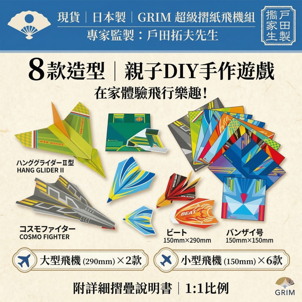 這款日本製【GRIM 超級摺紙飛機組】,由日本摺紙飛機協會會長 戶田拓夫先生監製,特別設計了 8 種不同造型的紙飛機,讓孩子和大人都能輕鬆體驗折飛機的樂趣!