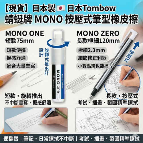【現貨】【日本製🇯🇵】 日本Tombow 蜻蜓牌 MONO 按壓式筆型橡皮擦|旋轉式推出設計|便攜替 日本橡皮擦