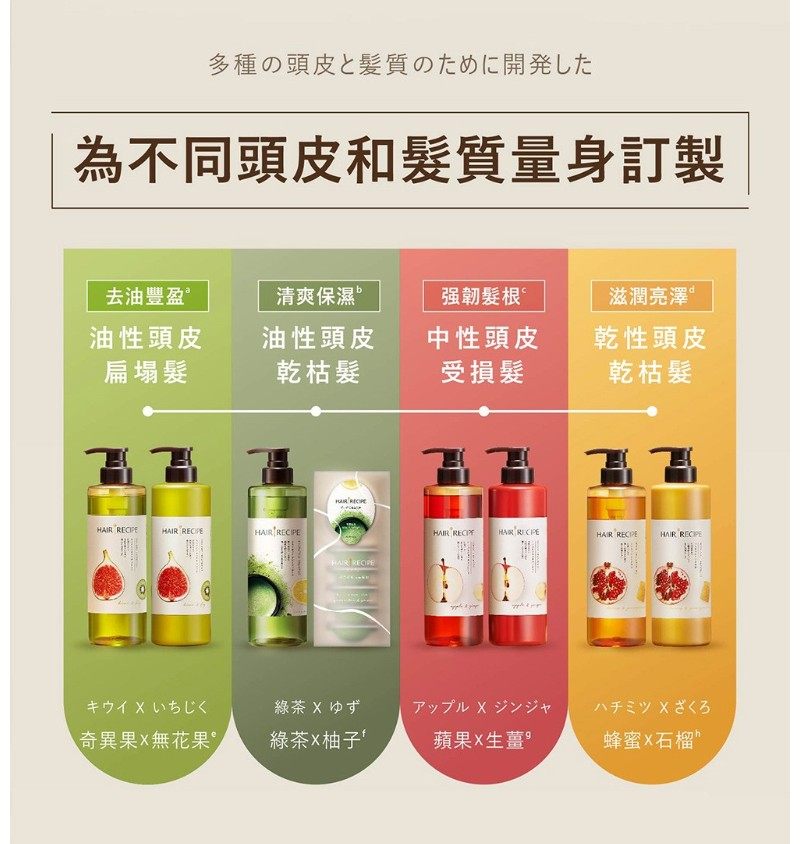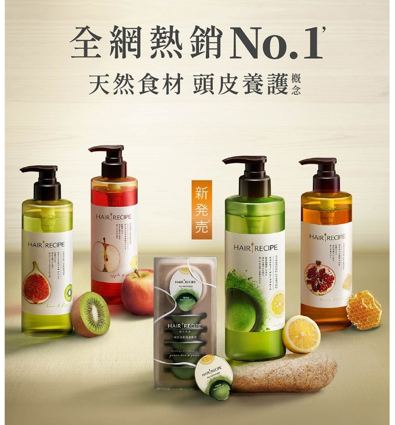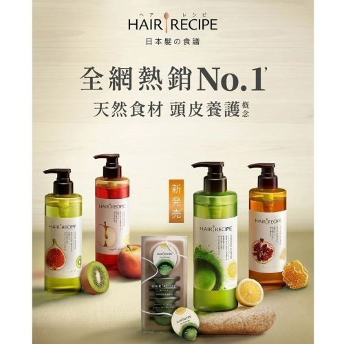 商品名稱:HAIR RECIPE 髮的食譜 蘋果生薑 綠茶柚子 奇異果無花果 蜂蜜石榴 洗髮精 洗髮乳 潤髮乳 530ml/瓶