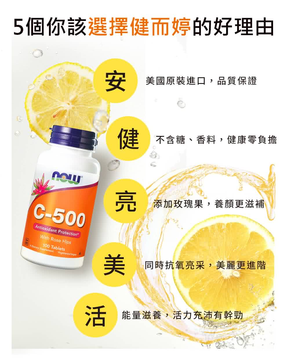 NOW Foods 維他命C-500補充錠,每錠提供500毫克維生素C,有助於促進膠原蛋白的形成,維持肌膚彈性與光澤,能幫助身體抵抗自由基的侵害,維持健康。本產品特別添加玫瑰果,能增強維生素C的吸收利用,提升整體效果。每日補充,讓您由內而外散發健康活力。適合素食者食用。