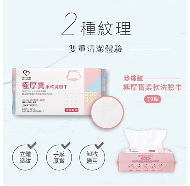 MY SCHEMING 我的心機 極厚實柔軟洗臉巾,為您帶來全新的潔膚體驗。這款洗臉巾採用珍珠紋水針布材質,觸感極致柔軟,呵護您的嬌嫩肌膚。每包含有70張,尺寸為20x20公分,厚實的質地使其吸水性更佳,輕鬆帶走污垢和殘妝。不含螢光劑、漂白劑等刺激成分,使用更安心。無論是日常清潔、卸妝還是濕敷,MY SCHEMING洗臉巾都能滿足您的需求,讓您的肌膚時刻保持清爽潔淨。