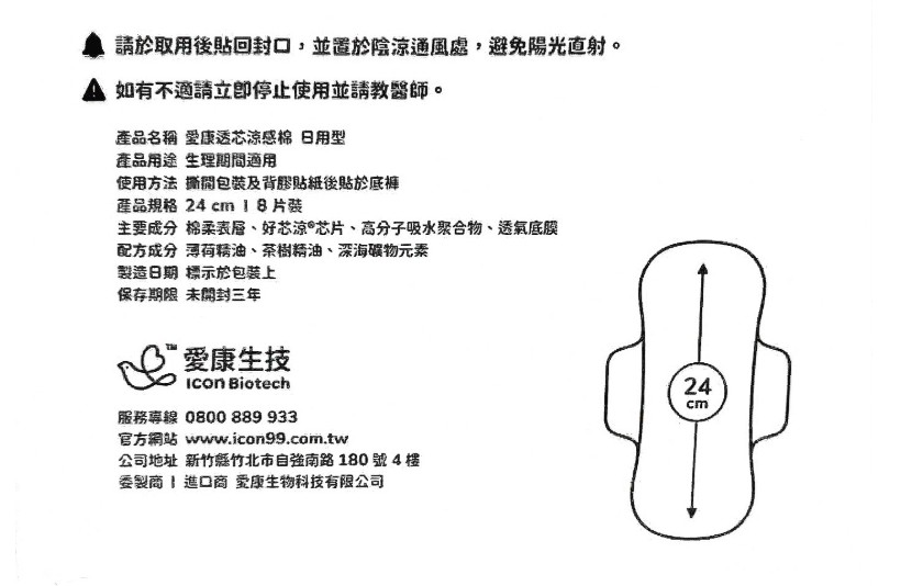 商品名稱:icon 愛康 涼感衛生棉 日用型 24cm 8片 15片 24片 深海礦物配方 草本精油