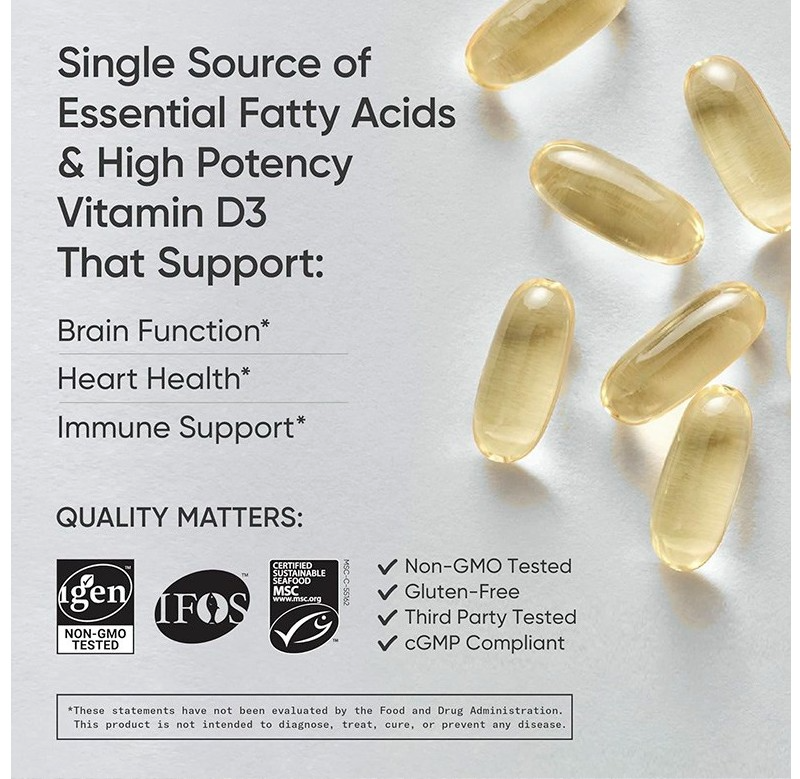 SPORTS RESEARCH Omega-3魚油維生素D3軟膠囊,結合了深海魚油與維生素D3,提供每日所需的Omega-3脂肪酸和維生素D。這款產品選用來自阿拉斯加的野生鱈魚,確保魚油的純淨和高品質。每顆軟膠囊提供1040毫克的Omega-3,包含EPA和DHA,有助於心臟和大腦的健康。同時,它還含有2500 IU的維生素D3,有助於增強免疫力。本產品經過第三方測試,無麩質、非基因改造,讓您安心食用,輕鬆補充每日所需營養。