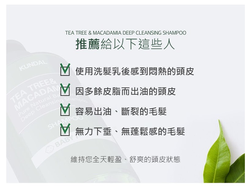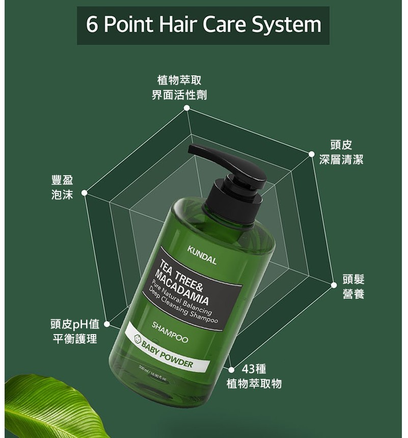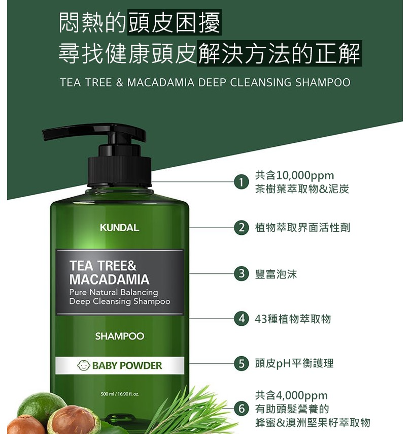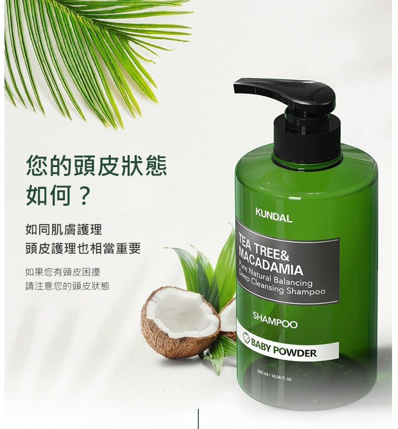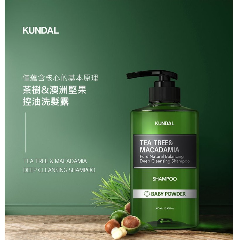 商品名稱:KUNDAL 昆黛爾 茶樹澳洲堅果控油清爽洗髮露 洗髮精 Baby Powder 1.058L 1瓶