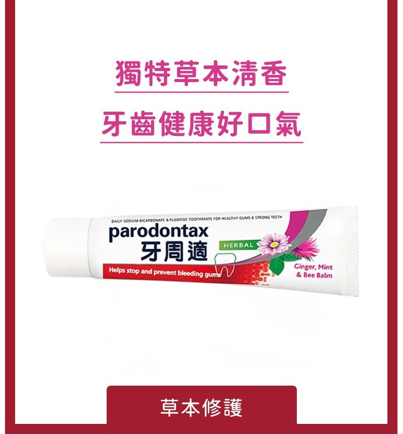 ☆每日使用牙周適草本修護牙膏,幫助您有效去除牙菌斑,維持口腔健康,展現自信笑容。