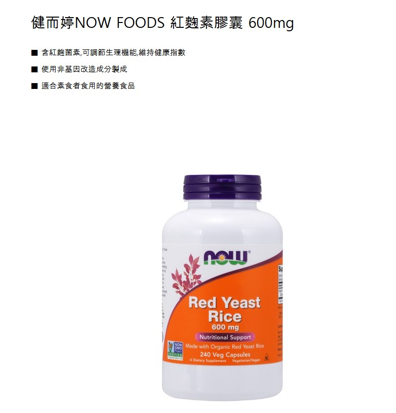 商品名稱:NOW Foods 紅麴素食膠囊 600mg 240顆 × 1罐