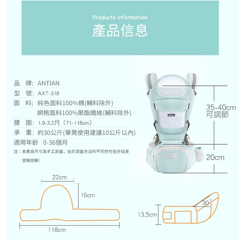 商品名稱:ANTIAN 嬰兒雙肩背帶/可收納腰凳背巾/透氣多功能新生兒背板 藍色