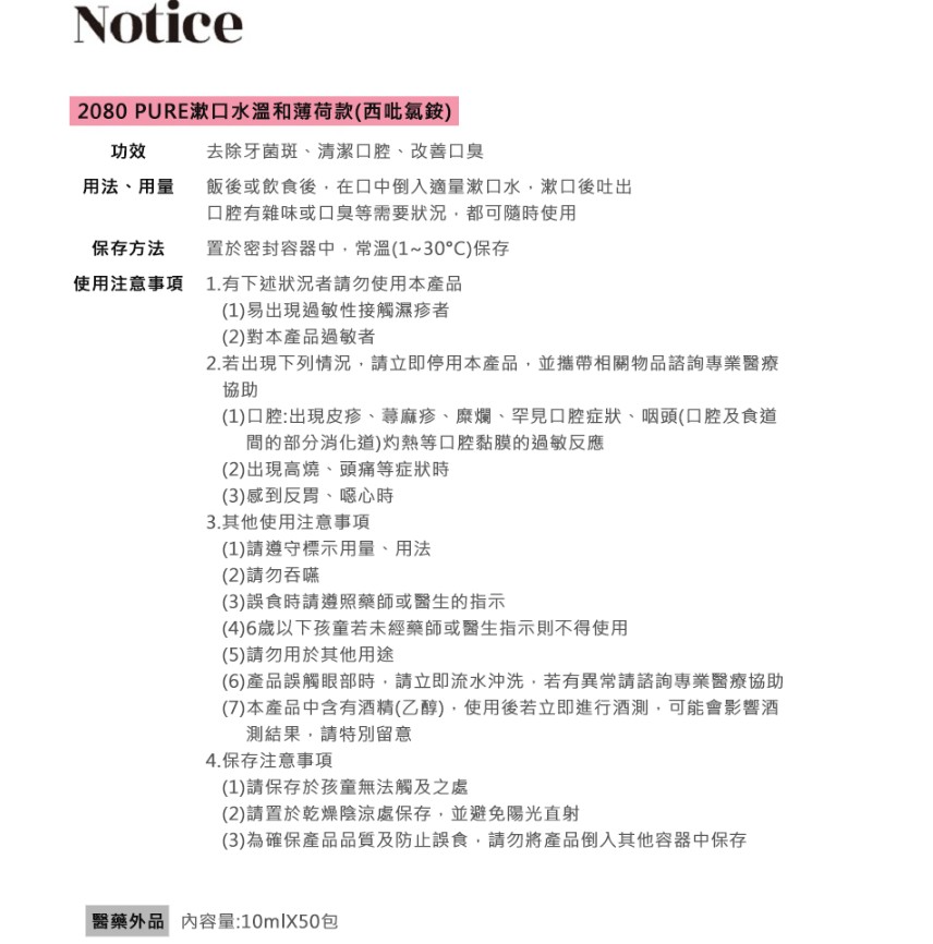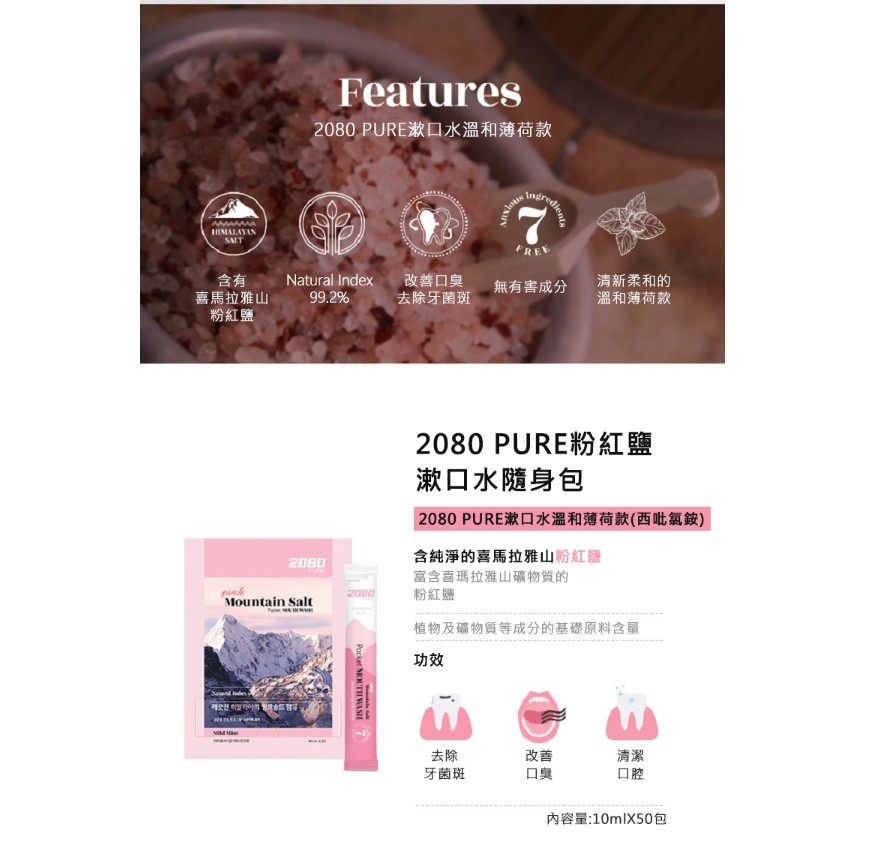 2080喜馬拉雅粉紅鹽漱口水,採用來自喜馬拉雅山的珍貴粉紅鹽,能溫和清潔口腔,幫助去除牙菌斑和異味,讓口氣清新。小包裝設計方便攜帶,隨時隨地保持口腔清潔。溫和薄荷香氛,使用後口氣清新舒暢。無添加7種成分,使用更安心。搭配2080牙膏使用,預防蛀牙效果更佳。