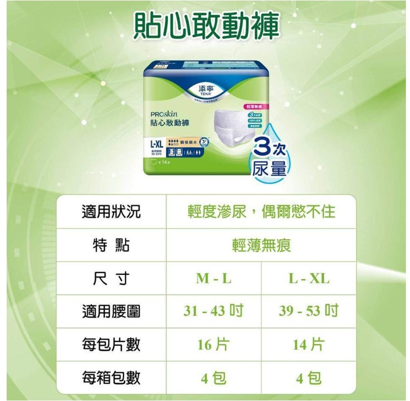 商品名稱:TENA 添寧 貼心敢動褲 31-43吋 M-L 16片 1包 腰圍39-53吋 L-XL 14片 1包