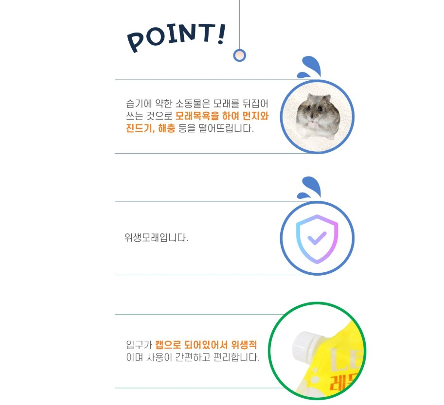 ■ 專為怕濕倉鼠設計,透過沙浴方式,幫助去除塵蟎和害蟲,維護皮膚健康,讓倉鼠遠離皮膚問題。