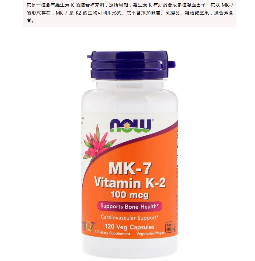 商品名稱:NOW Foods MK-7維生素K-2素食膠囊 100mcg 120顆 1罐