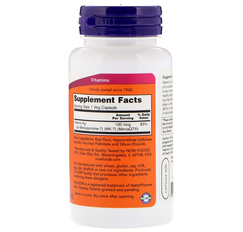 NOW Foods MK-7維生素K-2素食膠囊,是您維持骨骼和心血管健康的理想選擇。每粒膠囊含有100mcg的MenaQ7® MK-7,這是一種生物可利用的維生素K-2形式,有助於鈣質代謝,促進骨骼健康。維生素K-2在血液凝固中也扮演重要角色,同時支持健康的動脈功能。本產品不含小麥、麩質、大豆、牛奶、雞蛋、魚類、甲殼類或芝麻成分,適合素食者和對這些成分過敏的人士。每日一粒,隨餐服用,輕鬆補充所需營養,維持健康活力。