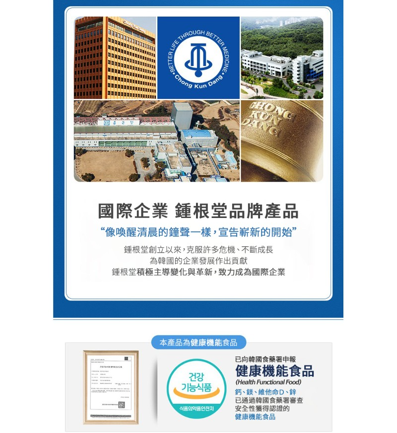 ◎商品名稱:Chong Kun Dang 鍾根堂 鈣鎂鋅維生素D補充錠 180顆 1罐