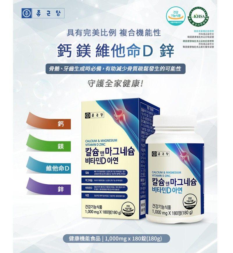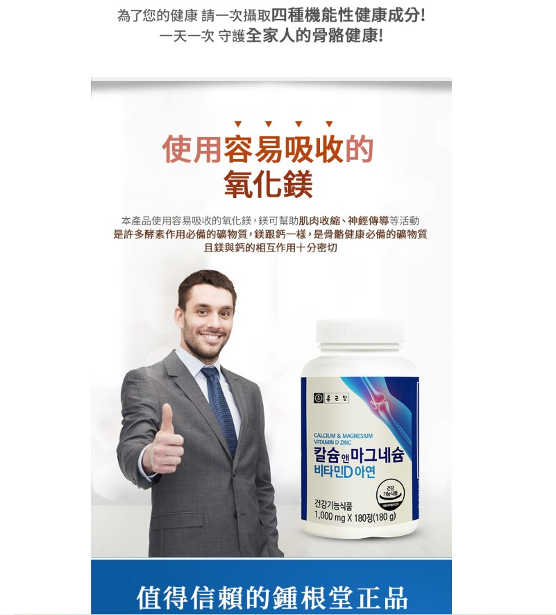 ■ 鍾根堂鈣鎂鋅維生素D補充錠,維持骨骼健康,鞏固牙齒,讓您笑容更加燦爛自信。