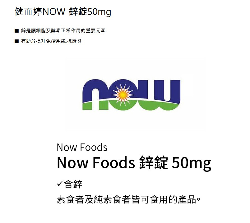 商品名稱:NOW Foods 鋅錠 50mg 250顆 1罐